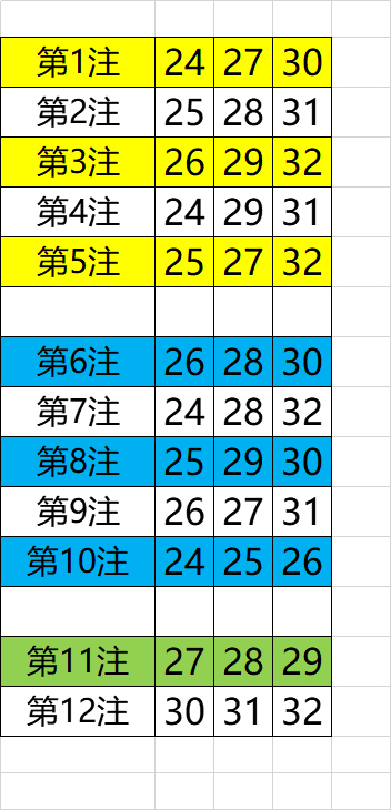 投注策略依然是采用矩阵打法,9码可以选择选3,中2保2,矩阵组合是12注,如下: