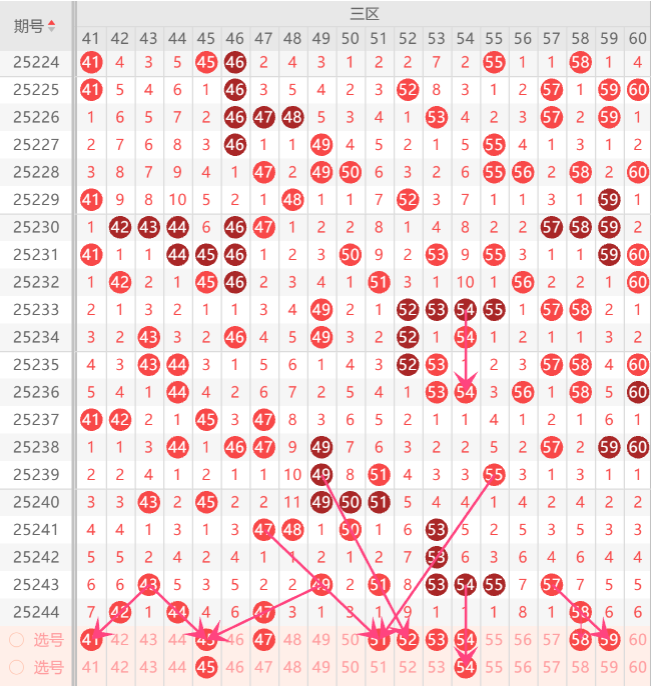 而三区重点关注的号是45.47.48.50.51.54.59.中参考2-3码开出机会,