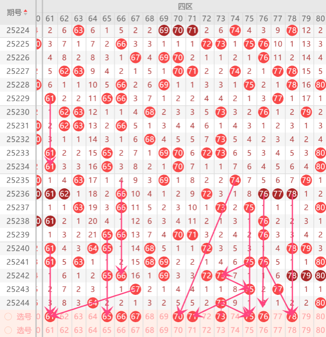 四区在近期的走势上来判断机会的话,整体区间上开始走热形态,上期四区间再次开出了平均3码机会,而上期区间开出的形态是空位回补和重码回补走势,那么本期四区间首先注意孤码分边上63.65.72.74.中参考一码开出机会,而重码上64.73.中布局一码开出机会,可以选择一码做胆,至于对称形态上61.63.66.中开出一码机会,而隔期回补上的75.77中参考一码开出机会,如图所示。