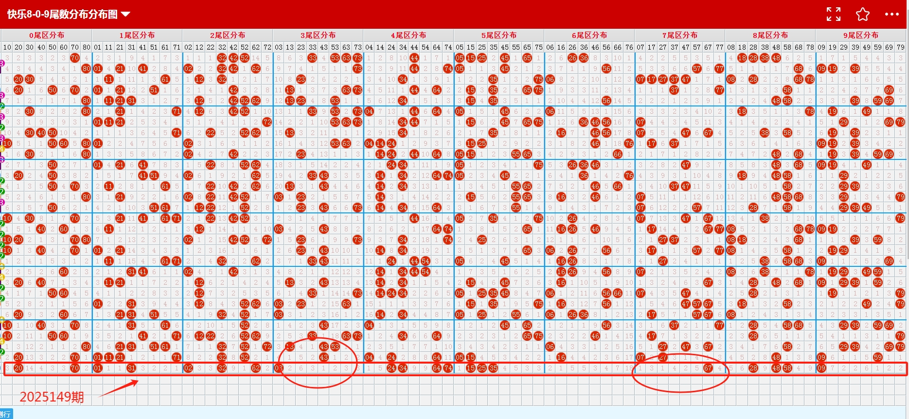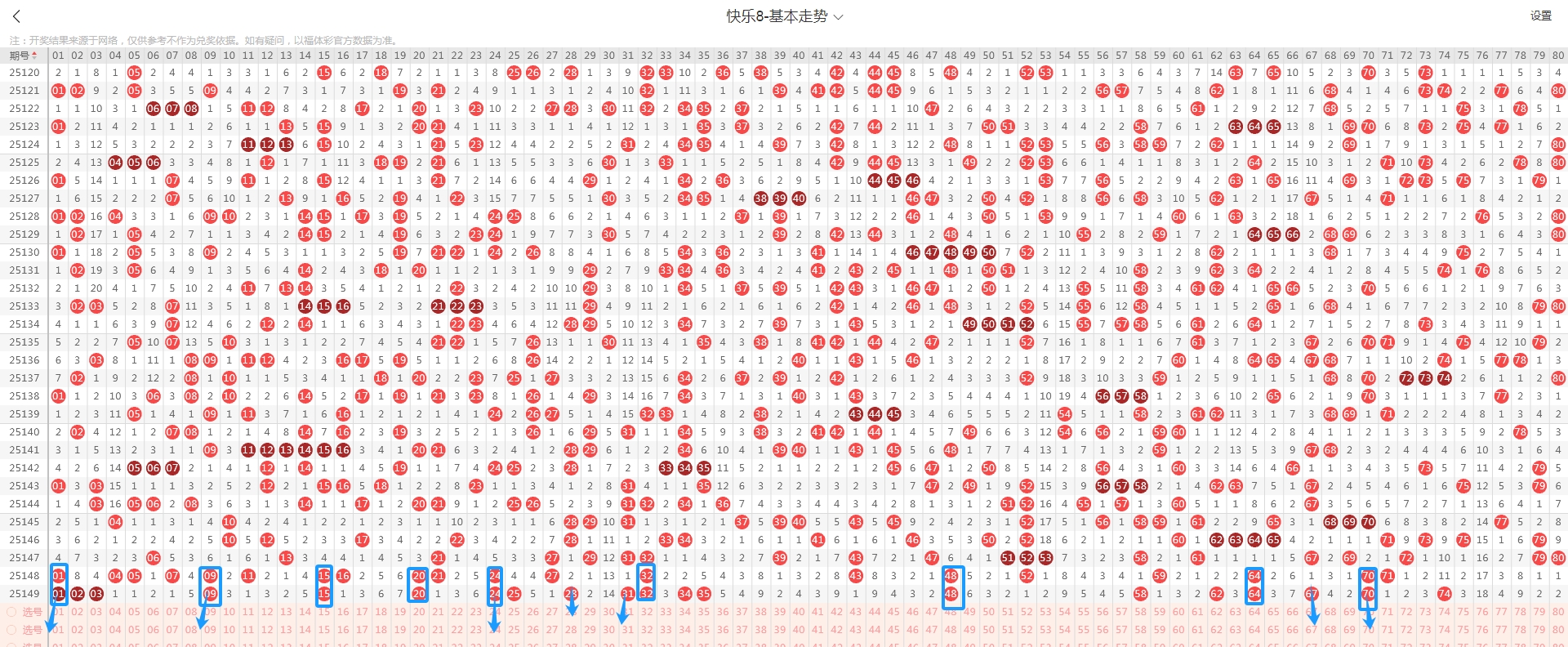 上图是快乐八2025149期重码走势图,画蓝色方框图标的是开出来的重码,开出了9个,与上期重码数量增加;分布位置集中在一、二、四区域下号。从重码图上看,近5期重码下号数量有转暖的趋势。但近期重码下号数量比对,发现在2-10个号码之间均衡下号,所以本期判断重码延续概率极大,可以参考7个左右;建议多加关注(01、09、24、28、31、67、70);