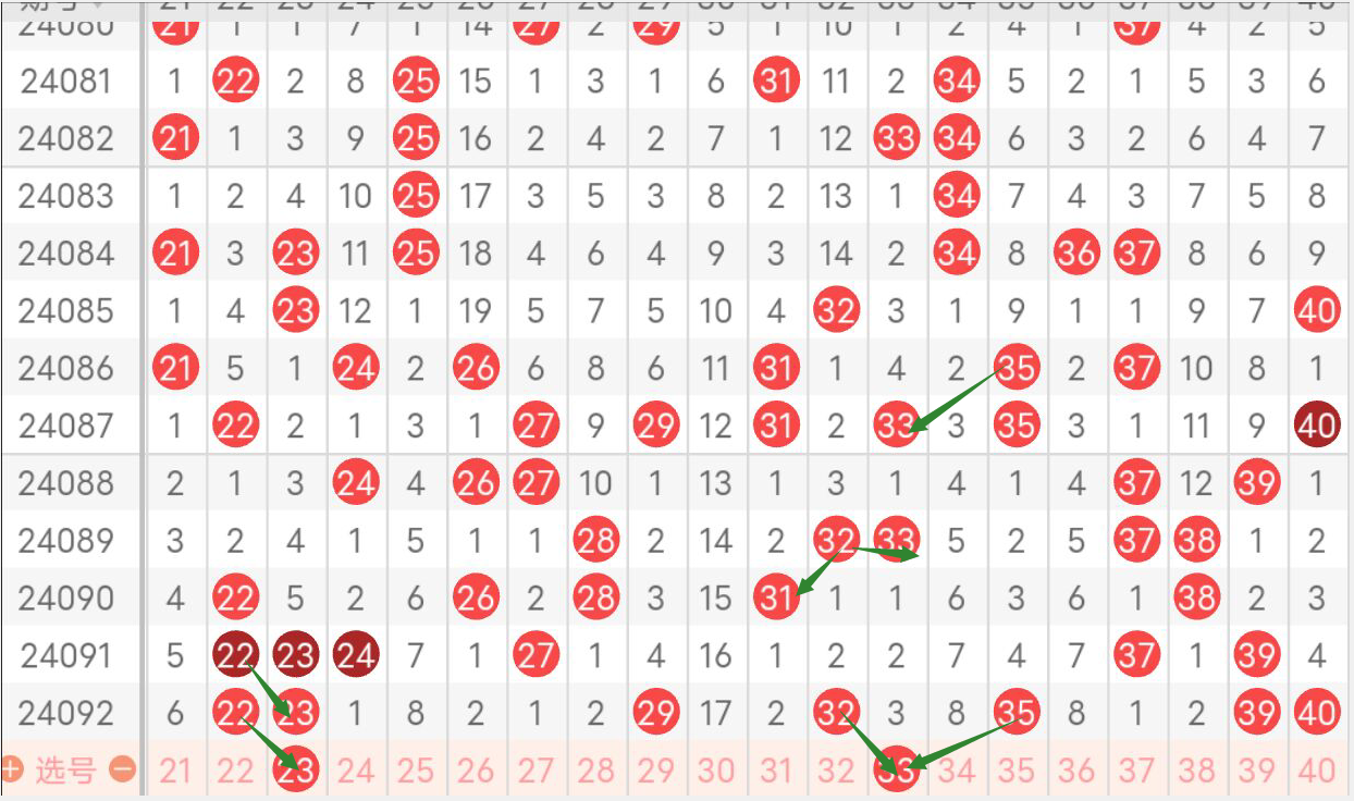 快乐八093期二区分析:本区域看好二码23 33号,23号近期温码,近期出现次数较以往频繁,按热号走势近期看好座号,伴有上期的相邻号码,可能会出现下期斜连走势,33号为近期热码走势,虽有单码下落形态,但热区恒热的道理,本期还是很看好33号的,与上期有右上斜连可看35 37号,相邻号看上期32号,综上述可定位一码。