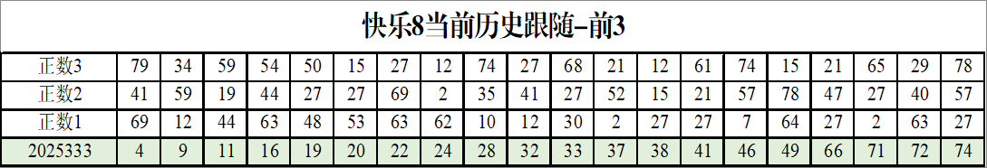 我感觉选热的同时,还要注意防冷条件开出,可以直接选取每个号码跟随出次前三的号码,也可以考虑把出次最后的三个数字加进去,不过这样可能号码太多,可以尝试。图上也能看出单独号码跟随的情况,我就不一一统计每个号码的出次了,我这里考虑提高概率,取每个号码历史跟随的前三号码和后三号码,根据2025333期的号码,我关注正数3和倒数3的号码号码为:
