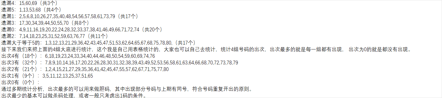 我的基本思路是通过号码尾数情况,取出6尾相关的号码作为第一组大底,然后统计号码跟随的情况分析出第二组大底,通过短期遗漏分析形成第三组大底,再按照对数补数分析统计出第四组大底(根据情况可能实时增加其他大底 ),最后把这些大底进行统计,重点关注出次最多的号码,搭配出次少的号码,灵活组号,形成本期精选胆码。