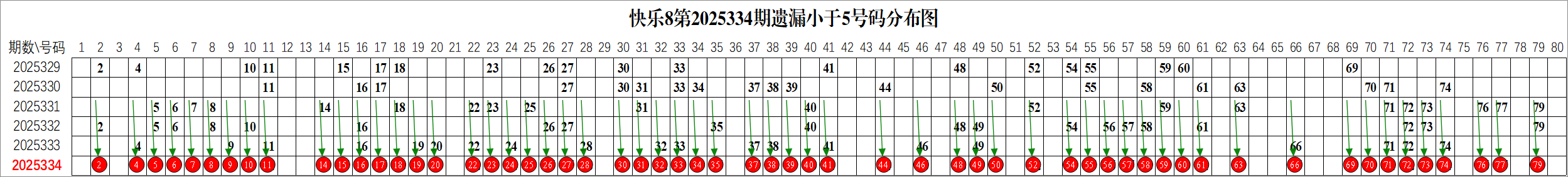 所以这个条件值得关注,从号码分布图上我们可以分析出,遗漏小于5期的号码有: