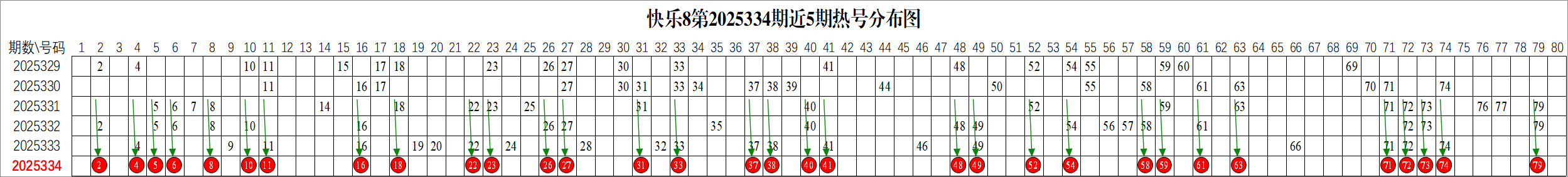 尾数分析其实是简化号码的做法,把80个号码用10个尾数来分析,通过多期来看,尾数变化灵活多样,我的思路是把上期尾数出次进行统计,分析出次多少情况,一般情况下,最热的尾数,下一期基本不会持续热下去,上期最冷的尾数,下一期也不会持续冷下去,所以我选取上期尾数排序中间的6个尾数作为本期看好的尾数,那么6个尾数包含了60个号码,相比较也是大概率开出号码的条件。