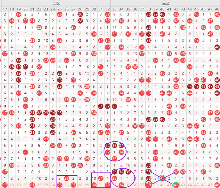 边号34 37 39 41出一码,重号33 38 40出一码,看上图勾画,三连号回补接着出边号,本期边号34优先,其次夹子号39,不喜欢39就拿37,形态上38 42是斜连号,8尾最热本期38如果不出4重号,优先48,关注五码33 34 37 39 48一胆34,双胆34 48