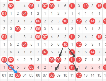 上图是福彩快乐8开奖号码走势分布图其中一部分,我标注出来的数字08 12看我标注出来的黑色小箭头表示的都是隔一期的斜连号码,我标注出来的数字03看蓝色小箭头是斜连号码,这里三个数字03 08 12。