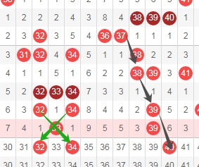 上图是福彩快乐8开奖号码走势分布图其中一部分,我标注出来的数字32 34看绿色小箭头是斜连号码,我标注出来的数字40看黑色小箭头是隔一期的斜连号码,这里3个数字32 34 40。