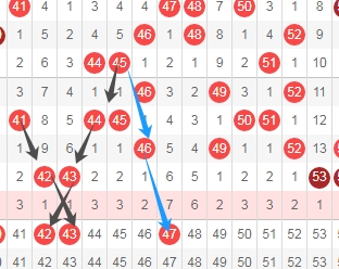 上图是福彩快乐8开奖号码走势分布图其中一部分,我标注出来的数字42 43看我标注出来的黑色小箭头表示的都是隔一期的斜连号码,我标注出来的数字47看蓝色小箭头是隔两期的斜连号码,这里三个数字42 43 47。
