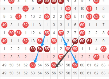 上图是福彩快乐8开奖号码走势分布图其中一部分,我标注出来的数字53 59看我标注出来的蓝色小箭头表示的都是隔一期的斜连号码,我标注出来的数字56看黑色小箭头是斜连号码,这里三个数字53 56 59。