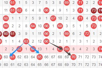 上图是福彩快乐8开奖号码走势分布图其中一部分,我标注出来的数字61 65看我标注出来的蓝色小箭头表示斜连号码,我标注出来的数字70看黑色小箭头是跨度二斜连号码,这里三个数字61 65 70。