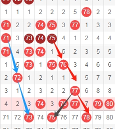 上图是福彩快乐8开奖号码走势分布图其中一部分,我标注出来的数字73看蓝色箭头表示跨度二斜连号码,标注出来的数字75看黑色小箭头表示斜连号码,标注出来的数字78看红色小箭头表示隔一期斜连号码,这里三个数字73 75 78。