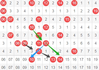 上图是福彩快乐8开奖号码走势分布图其中一部分,我标注出来的数字10看蓝色小箭头表示斜连号码,标注出来的数字13看黑色小箭头表示跨度二斜连号码,标注出来的数字14看绿色小箭头表示跨度二隔一期斜连号码,这里三个数字10 13 14。