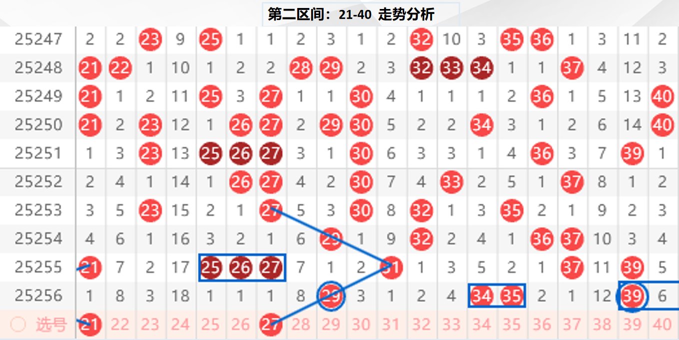 二区分析:【21-40】(走势图标注号码非小黄车大底,请谨慎参考,具体思路将在直播间分享讨论)