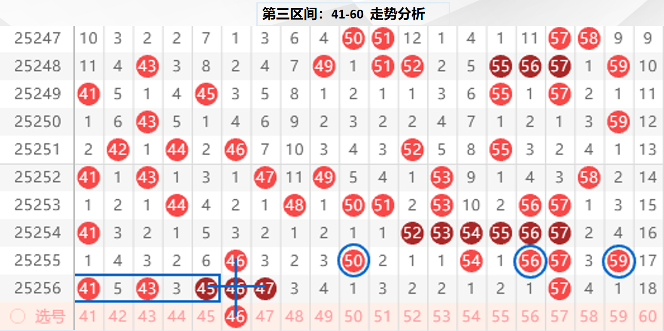三区分析:【41-60】(走势图标注号码非小黄车大底,请谨慎参考,具体思路将在直播间分享讨论)