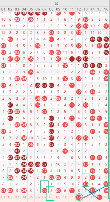 本期一区胆尾7尾1尾,边号3 5 6 8 10 12 13 15出一码,重号1 2 4 7 9 11 14  16出一码,形态上12 15是斜连号,上图已勾画,上期一区开出那么多确实没想到,本期大概率有重号,近期1开头出重号,那么本期1开头11 14 16出一码,优先11,其次防2 7出重,那么重号就是2 7 11三出一,6尾出2期,本期防6,遗漏值隔2期号出多期,上图已勾画,本期只有8符合,上一期的追号2 8有概率再来一次,13遗漏值隔期5 4 3 2今天刚好是1期,结论关注五码 2 7 8 11 13防6