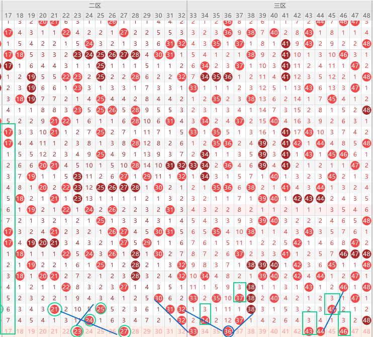三区胆尾3尾0尾,边号33 35 36 38 47出一码,重号34 37 48出一码,三区是走热趋势,形态上33 36 44是斜连号,上图已勾画,隔三期号出多期,本期隔3期号43 46二出一,有概率同出,43 46最近也挺喜欢同出,看准一个号可以拿43 46打复二,8尾出4期,本期看好8尾不断,那就是38 48二出一,结论关注五码33 35 37 38 43防48