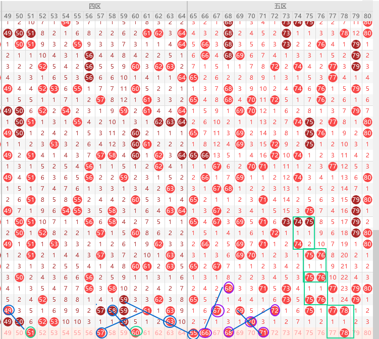 四区胆尾4尾1尾,四区热2期了,本期看好可以持续走热出3-5码,边号51 54 58 60 62 64出一码,重号49 50 52 53 59 63出一码,形态上51 57 60是斜连号,上图已勾画,9尾最热,出3期,本期大概率要断,如果四区9尾不断,另外四个区最多出一个9尾,上期三连号下面出重号,跟趋势本期三连号应该也走重,那就是48 49 50出一码,看好50,如果有50,本期大概率还有同尾号,那么60就可以一起考虑,其次重号考虑53 63出一,四区短期规律,非常喜欢出遗漏值隔10期的号,本期54 55 64极大概率出一码,5尾上期断尾,55是个纠结号,杀不掉,也不是太好出,那就是54 64二出一,结论关注六码50 51  53 54 60 64防62