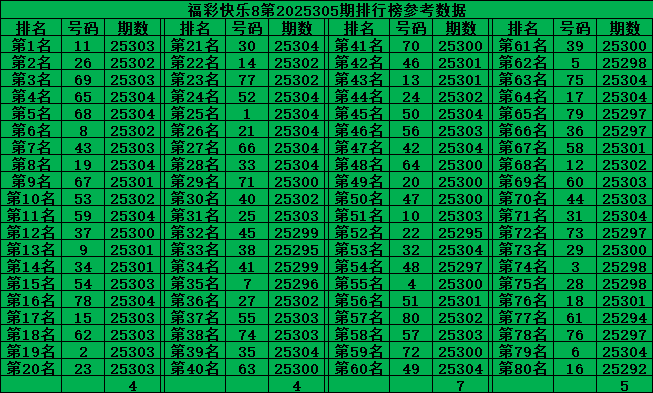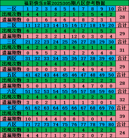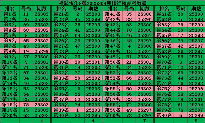 最后再把号码分为五区:一区01-16号、二区17-32号、三区33-48号、四区49-64号、五区65-80号,理论上每个区每期应该开出4个号码,2025304期五区比例:2:6:3:4:5