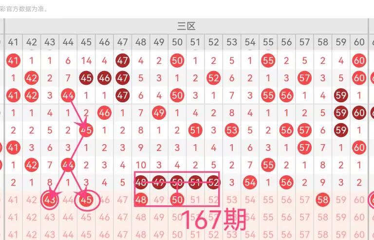 41-60区间,在上期开出了7个号码(48 49 50 51 52 54 56),此区间出号较热。按照走势规律,密集出号后往往会出现一定程度的回落,预计本期会减少到2-3个左右。这个区间的号码特征比较明显,经常会出现斜连号或等距出号的情况。比如前期开出44出现可能会带动号码43和45的出现。号码48遗漏多期后,常常会回补出现,形成宠爱后形式。号码48和50作为本区间较冷的号码,存在一定的回补率,看好此号码的出现。因此综合推荐该区间号码【43 45 48 50 58】