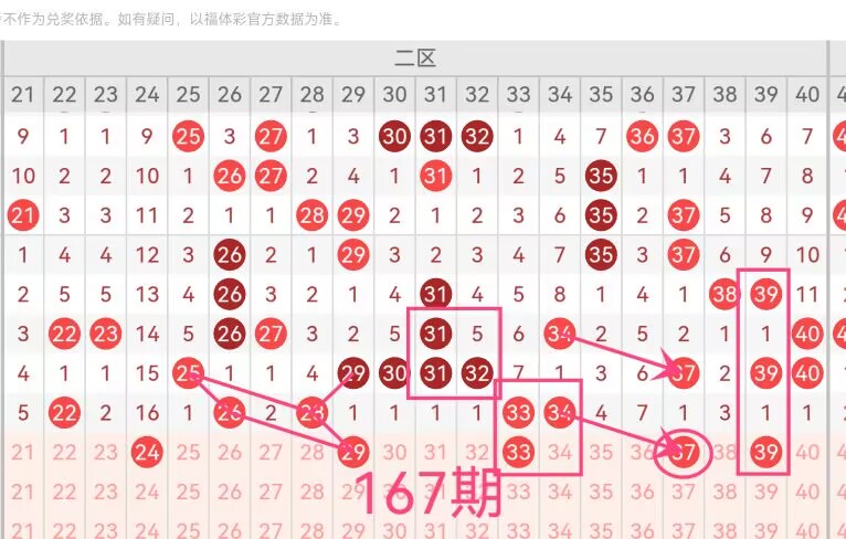 21-40区间,上期仅开出5个号码(22 26 28 33 34),此区间出号较平稳。这个区间最大的特点就是容易出现等距出号的情况,比如前期开出的22和26很可能带动号码24在本期出现。近期遗漏值适中的稳码值得关注,如号码37和39已经遗漏1期,这个号码符合“遗漏回补”规律,具有较高的会概率。冷号33在最近5期出现1次,属于本区间较为冷的号码之一,本期考虑号码33会回补出现的情况。因此综合推荐该区间号码【24 29 33 37 39】