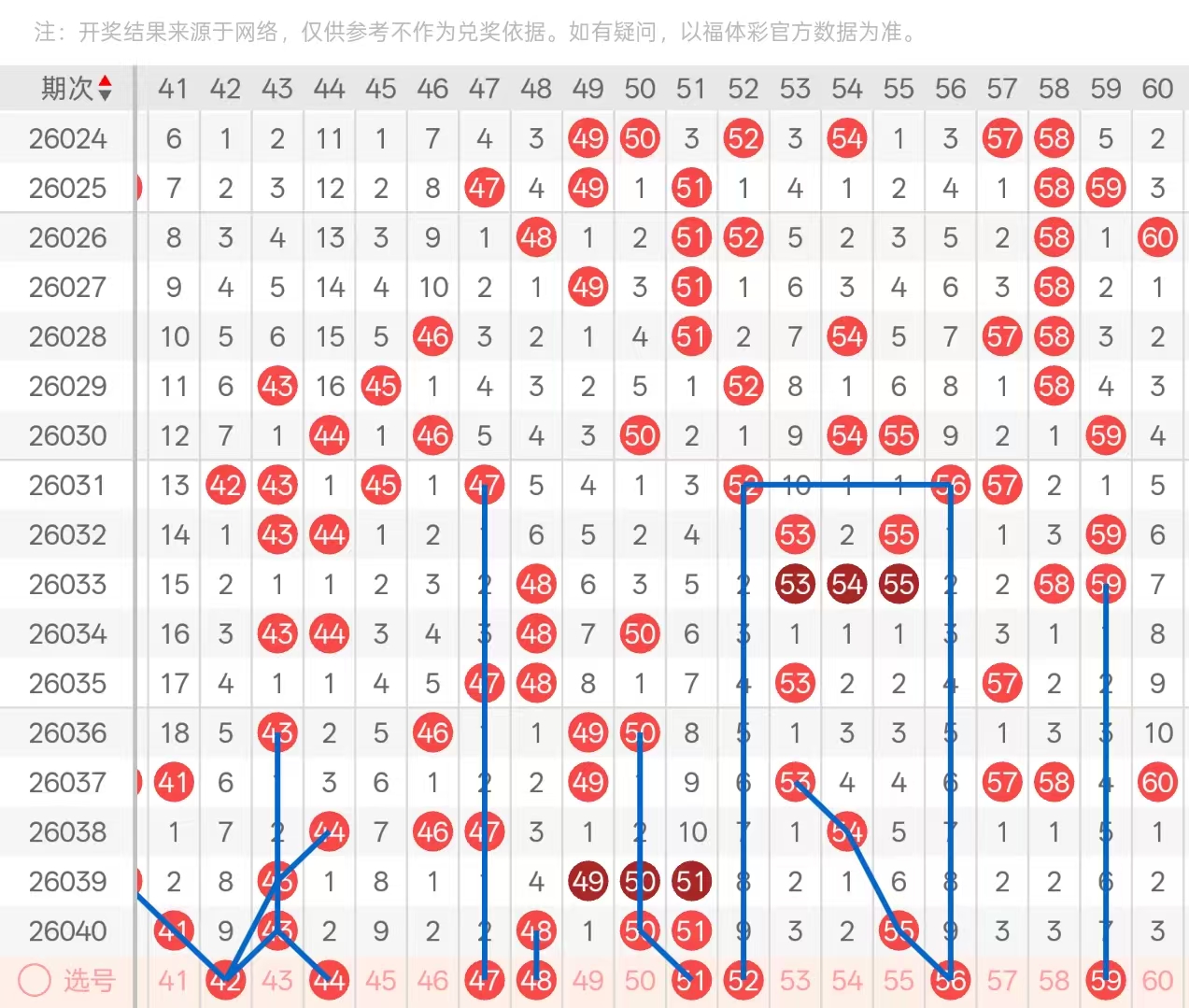 三区:三区间上期开出6码,四字头头部位置开出大遗漏空2回补的41,和43两期遗漏座重,尾部位置则开出了连号495051的分边号码48,以及两期遗漏做重的50。五字头开出头部位置十期遗漏做重的51,中部位置六期遗漏回补的55,以孤码形态开出,尾部位置处于放空状态。本期四字头头部位置可关注三斜连号码42的9期遗漏下落,与45两码做二选1,其次44-46-47三码两期遗漏回补做一码即可,防守尾部位置48的座重,梅花形态49在本期可防守开出。五字头头部位置优先关注5256两码九期遗漏下落,近期九期遗漏两码二选一是峰值,56为55孤码的分边号码,可防守开出575860三码做3保1,即可,防守七期遗漏的59下落。