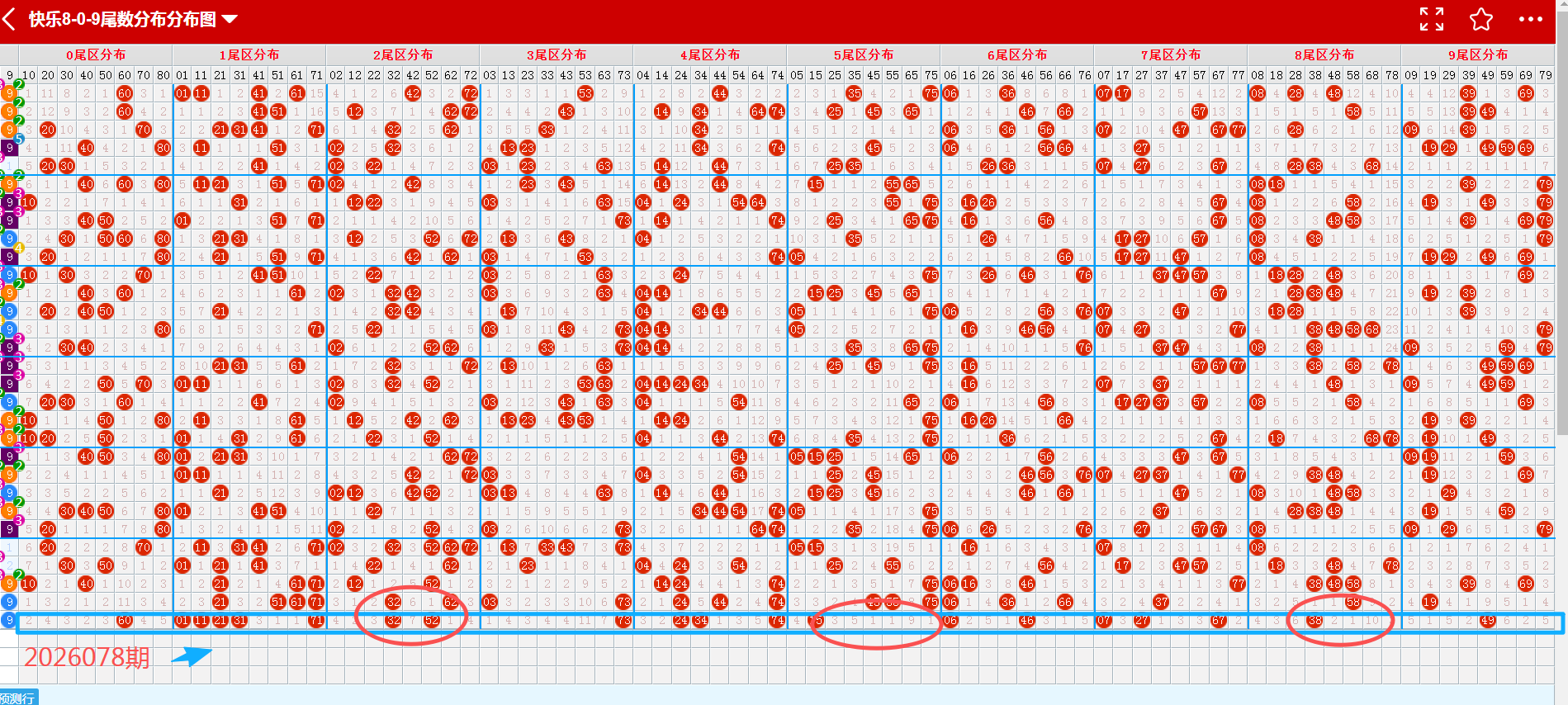 上图是快乐八2026078期的尾码走势图,从图中看0尾到9尾出号个数依次是:0尾号码区开出1个;1尾号码区开出5个;2尾号码区开出2个;3尾号码区开出1个;4尾号码区开出3个;5尾号码区开出1个;6尾号码区开出2个;7尾号码区开出3个;8尾号码区开出1个;9尾号码区开出1个;再看小尾号码(0尾-4尾)区有12码,大尾号码(5尾-9尾)有8码;数据比对统计后可以看到本期1尾出号数量最多,一共开出了5个中奖号码。本期没有尾区出现断区!由走势比对推断2026079期重点需要关注2、5、8尾区号码下号热度回补和落号数量增加的概率较大。