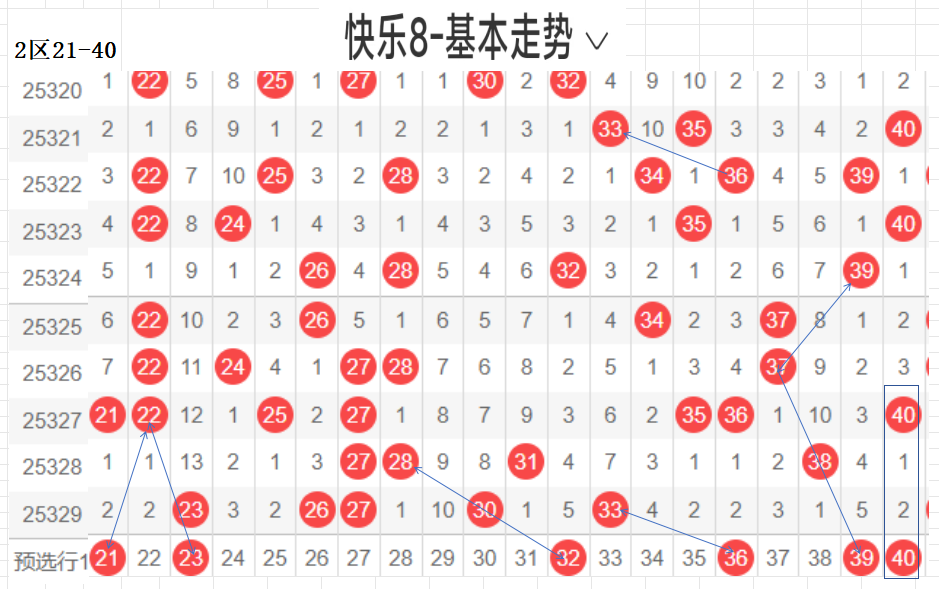 二区(21-40):遗漏5期以下有19个,0码23 26 27 30 33 5个,数据所示,冷码平均,选择条件增多了.上期开出了5个号码,出码比较分散.这期布防相应增加,重码按比例落这区较少,先给出关联码32,这个区间间接走势,温区,21-30区间上期开了4个,依旧不是重点选号区间,31-40区间开出1个,本期关注热码的回补,间隔小遗漏值最佳,3字头转热,这个小区热码注意回调,可以做关联码的布局,注重温冷码的回补.