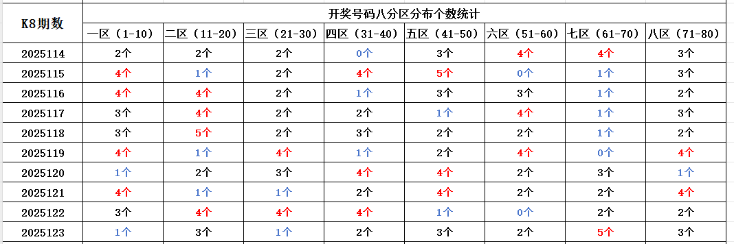 如图,红色字体是热号区,区间开出4个及以上号码。蓝色字体是冷号区,区间开出1个及以下号码。以近10期为一个分析周期,持续走热的区间:八区。持续走冷的区间:三区。依据久热必冷,久冷必热的规律,本期重点关注:四区、七区,区间可能开出2-3个号码。一区、三区,区间可能开出1-2个号码。个人分析,仅供参考。
