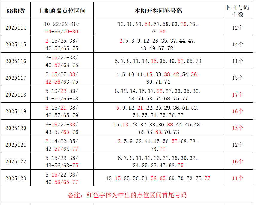 如图,上期的遗漏号码在下期开出10个左右,即为回补号码。定准点位区间首尾号码是关键!以上期2025123期(会员专区数据)为例,定位4个遗漏区间,围11码!结合上期开奖号码,以跨度值大于或等于7为依据,本期关注3个遗漏区间:1-13/21-35/51-58 ;重点关注遗漏-区间:****(会员专区可见),区间遗漏号码可能在本期回补开出。注意区分遗漏区间回补号码和大底号码,不要混淆。个人分析,仅供参考。