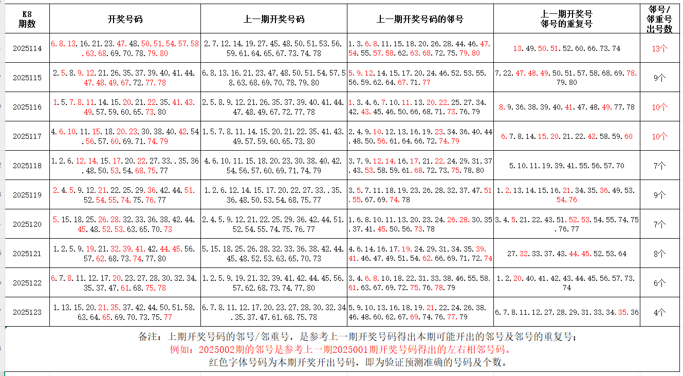 如图,红色字体是上期邻号、邻重号在下期开出,每期开出10个左右。上期邻号开出3个,邻重号开出1个。本期参考邻号:2.12.16.19.22.34.38.41.45.49.52.57.59.62.66.68.71.72.78;邻重号:14.20.21.36.43.50.51.63.64.65.69.70.74.76;个人分析,仅供参考。
