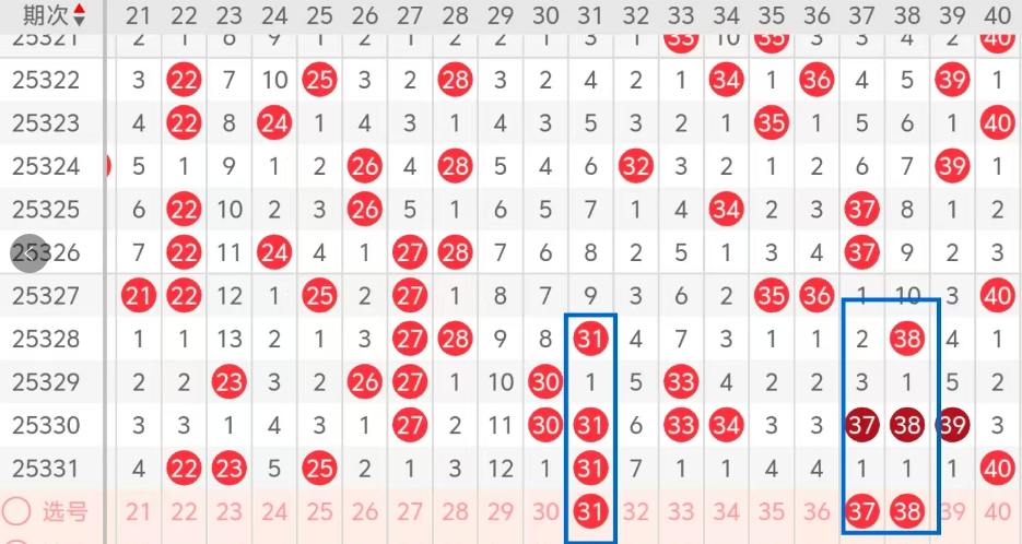 第二区间的走势分析:第二区间上期开出了五个号码球,主要的落号点位在二区间的前后半区,走出了三奇两偶的形态走势,上期二区间的前半区落下了三个号码球,后半区落下了两个号码球,整个二区间处于走暖的趋势,根据二区间的走势规律,今天的二区间我们主看后半区31重码的落位,走出三重码的走势形态,再看凤尾处37 38姊妹对号码球的落位,37 38都是走出了隔期对称的形态走势,重点关注31 38的组合,可以打个选三胆拖,这三个号球主看31 38,建议大家打个三码复二比较稳妥,参考为主!