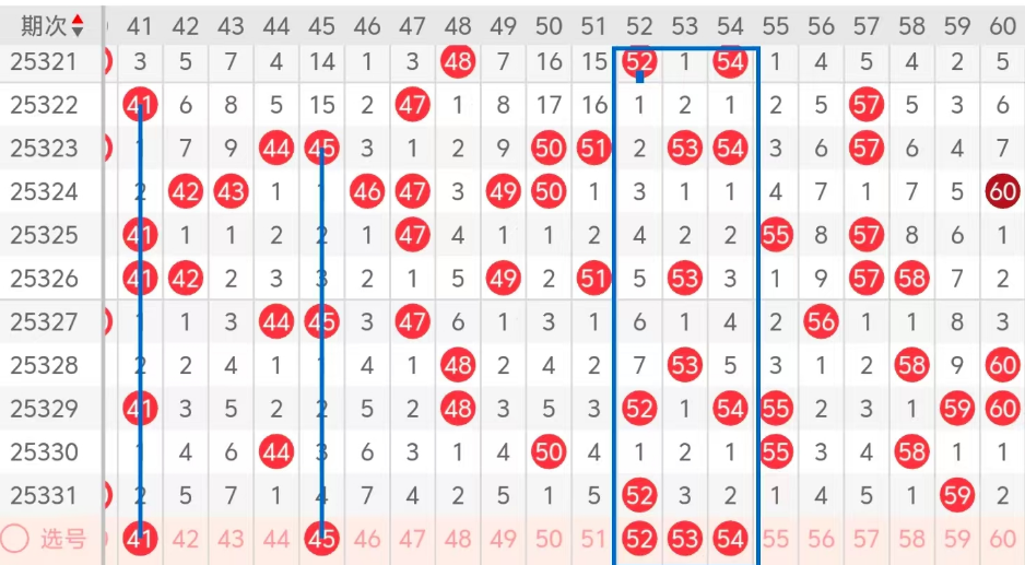 第三区间的走势分析:第三区间上期开出了两个号码球,主要的落号点位在三区间的后半区,走出了一奇一偶的形态走势,上期三区间的前半区没有号码球落下,后半区落下了两个号码球,整个三区间处于走冷的趋势,根据三区间的走势规律,今天的三区间我们主看前半区的41 45两个热码的回补,41走出了隔期对称的形态,45走出了边码的落位,再看后半区52 53 54这几个号码球的落位,52走出了重码,同时来下53 54,53 54都走出了斜连码的走势形态,这五个号球建议大家打个五码复三比较稳妥,特别关注52 53姊妹对的落位!参考为主!