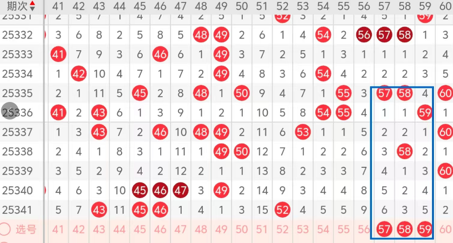 第三区间的走势分析:第三区间上期开出了四个号码球,主要的落号点位在三区间的前半区,走出了两奇两偶的形态走势,上期三区间的前半区落下了三个号码球,后半区落下了一个号码球,整个三区间处于走冷的趋势,根据三区间的走势规律,今天的三区间我们主看三区间凤尾处号码的回补,主看57 58 59这三个号码球的落位,57 59一边码的形态落下,58是热码的回补,落下2码的机会很大,注意两两的组合,这三个号球建议大家打三码复二比较稳妥,参考为主!