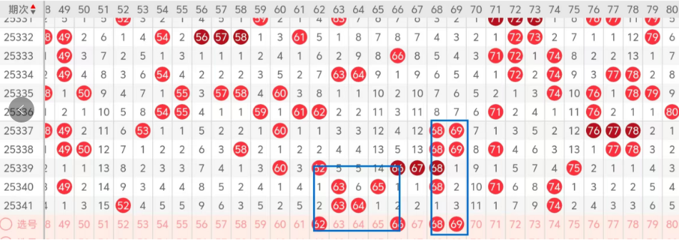第四区间的走势分析:第四区间上期开出了三个号码球,主要的落号点位在四区间的前半区,走出了一奇两偶的形态走势,上期四区间的前半区落下了两个号码球,后半区落下了一个号码球,整个四区间处于走冷的趋势,根据四区间的走势规律,今天的四区间我们主看四区间边码和热码的回补,主看62 66的组合,走出了对称的形态走势,再看68 69姊妹对号码的回补,也是热码的落位,这四个号球建议大家打个四胆拖,或者打个四码复三比较稳妥,参考为主!