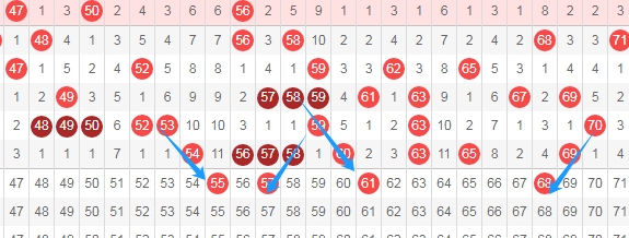 上图是福彩快乐8开奖号码走势分布图其中一部分,我标志出来的数字都是斜连号码,分别是数字55 57 61,数字55是从数字53一直斜连下去的,数字57是数字59一直斜连下去的,数字61一直从数字58斜连下去的,数字68一直从数字70斜连下去的,那么可以看好数字55 57 61 68出号码。