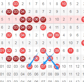 上图是福彩快乐8开奖号码走势分布图其中一部分,我标志出来的数字都是斜连号码,分别是数字05 07 09,数字05是从数字07一直斜连下去的,数字07是数字09一直斜连下去的,数字09一直从数字07斜连下去的,那么可以看好数字05 07 09出号码。