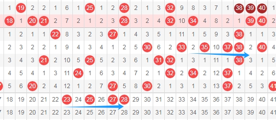上图是福彩快乐8开奖号码走势分布图其中一部分,我标志出来的数字23 25 27 28这里组成的图像蓝色横向箭头,和上面走势图中标志出来的蓝色横向箭头数字33 35 37 38,这两个蓝色横向箭头是不是很相似呢?那么可以看数字23 25 27 28出号码。
