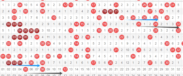 上图是福彩快乐8开奖号码走势分布图其中一部分,我标志出来的蓝色横向箭头两根是不是很相似的数字走势,然后上面的蓝色横向箭头后面出现了数字25 28 32按照这样走势的话,那么本期可以关注数字05 08 12这样走势的话,上面走势图中标志出来的横向黑色箭头是不是也相似了,那么关注数字05 08 12出号码。