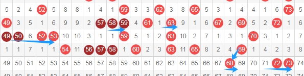 上图是福彩快乐8开奖号码走势分布图其中一部分,我标志出来的蓝色箭头,根据这些特点,我标志出来的数字68 72 73应该会出号码。
