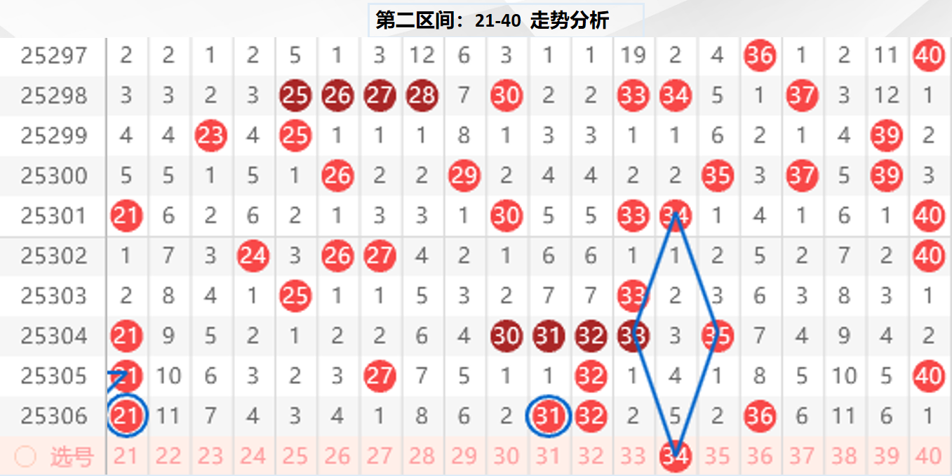 二区分析:【21-40】(走势图标注号码非小黄车大底,请谨慎参考,具体思路将在直播间分享讨论)