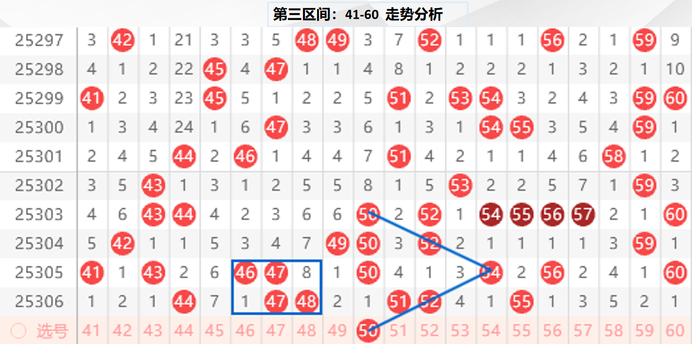 三区分析:【41-60】(走势图标注号码非小黄车大底,请谨慎参考,具体思路将在直播间分享讨论)