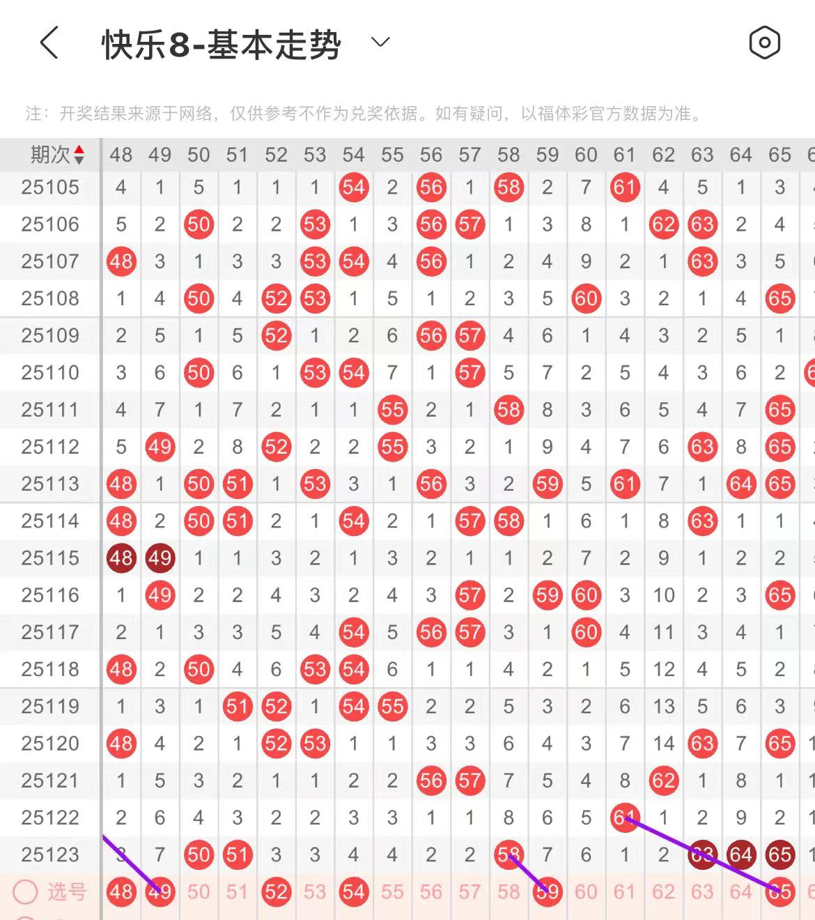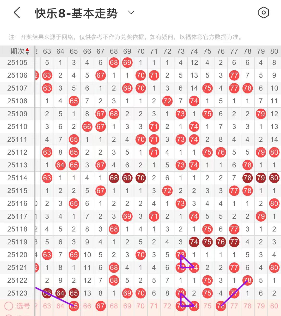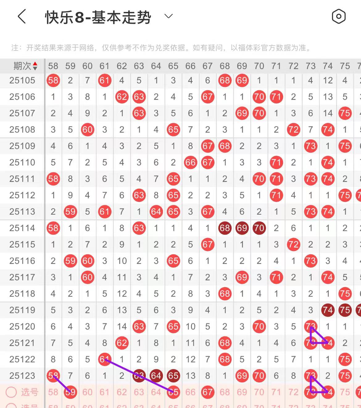 61-70区:本区间上期开出了五个号码,从号码走势图上看,上期出号个数突增,本期注意出号个数有所减少,在选号上需谨慎。本期有出号走势的号码有65号,斜连出号走势,防65.67同出的可能。