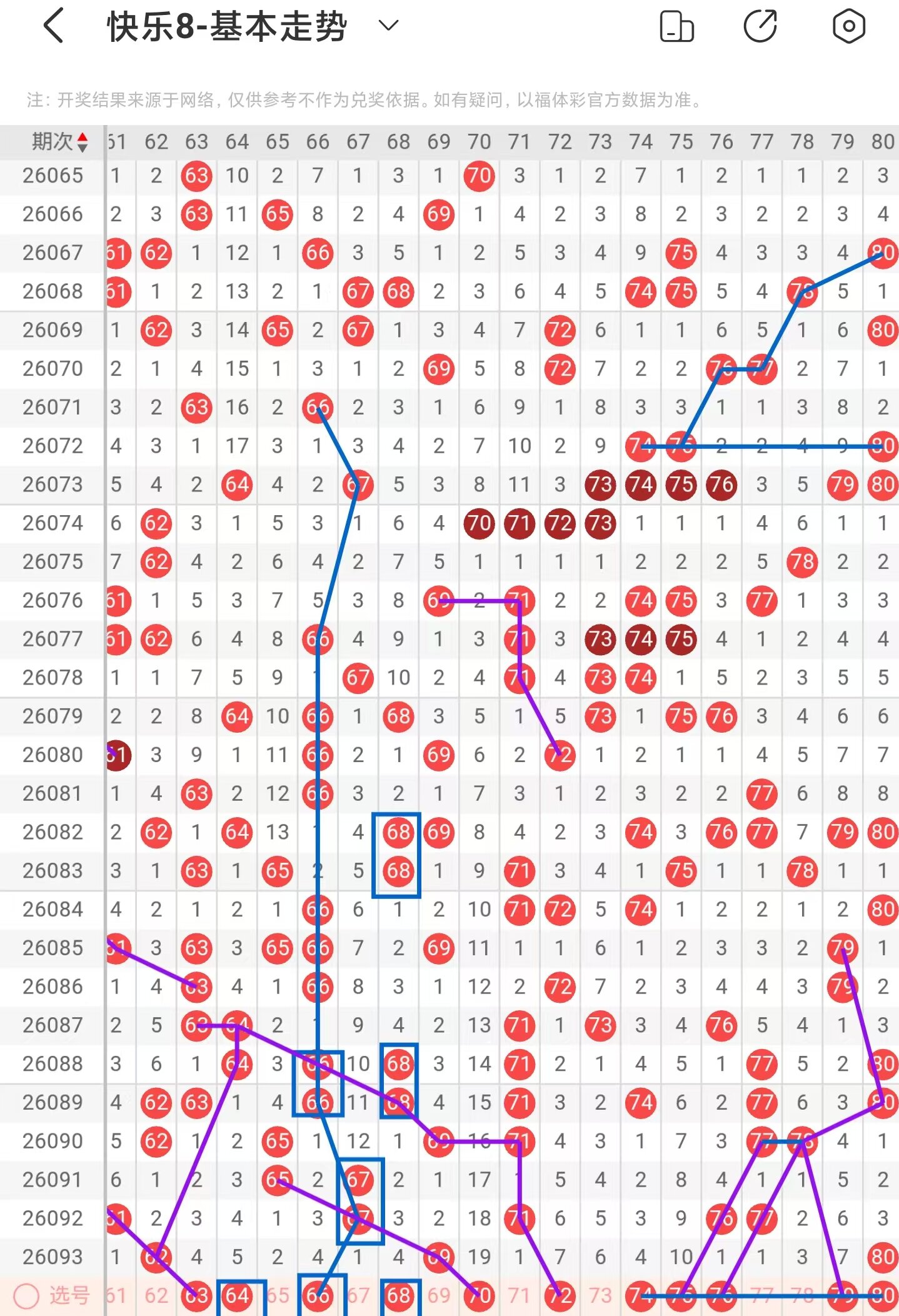 四区间上期小面积减少落号,一共开出三个号码球,本期考虑增加号码球的数量,注意斜连走势回补的63号码球,同时也是百期相似形态号码球,注意近期57、60、61号码球的走势相似,本期注意63号码球,阶梯落位重码走势注意64、66号码球,同时66号码球也是隔期对称走势回补号码球,注意近期64、66、68、69号码球的走势与65、67、69、70号码球的走势相似,本期注意70号码球,注意近期69、71、72号码球的走势相似,本期注意72号码球,阶梯落位连码走势注意75、76号码球,注意百期相似形态的79号码球,近期76、77、78、80号码球的走势相似,本期追74、75、80号码球,因此四区间关注63-66-72-75-80。注意本区间的选二复式63-72-80。