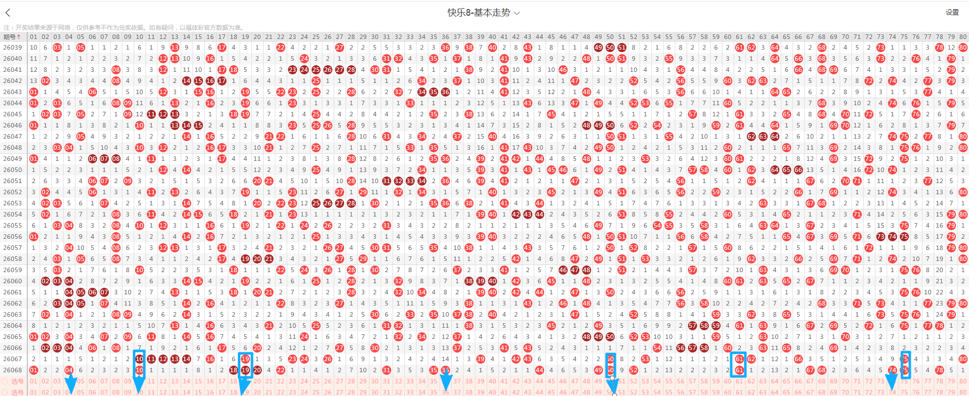 从2026068期重码走势图上看,画蓝色方框图标的是开出来的重码,开出了5个(蓝色方块标示的),重码数量与上期增加;从重码图上看,近10期重码下号数量有呈现升温的趋势。从近期重码下号数量的比对,可以发现中奖号码数量在1-10个号码之间均衡下号。综合推断本期重码热度回温概率极大,本期推断可以参考6个左右(蓝色箭头标示的);建议多加关注(04、10、19、36、50、74);