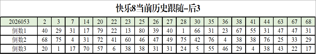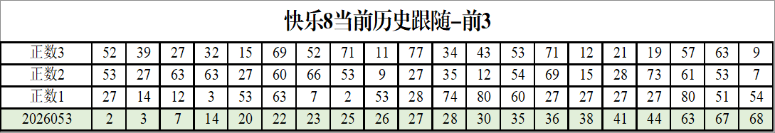 我感觉选热的同时,还要注意防冷条件开出,可以直接选取每个号码跟随出次前三的号码,也可以考虑把出次最后的三个数字加进去,不过这样可能号码太多,可以尝试。图上也能看出单独号码跟随的情况,我就不一一统计每个号码的出次了,我这里考虑提高概率,取每个号码历史跟随的前三号码和后三号码,根据2026053期的号码,我关注正数3和倒数3的号码号码为: