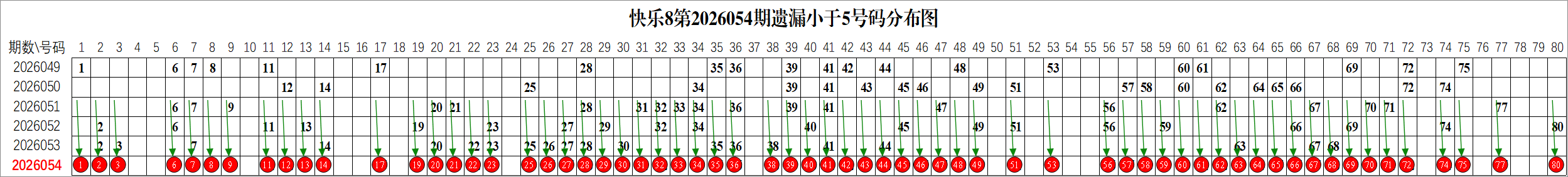所以这个条件值得关注,从号码分布图上我们可以分析出,遗漏小于5期的号码有:
