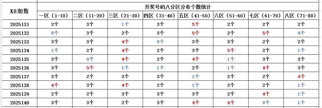 如图,红色字体是热号区,区间开出4个及以上号码。蓝色字体是冷号区,区间开出1个及以下号码。以近10期为一个分析周期,持续走热的区间:三区、七区。持续走冷的区间:八区。依据久热必冷,久冷必热的规律,本期重点关注:三区、五区,区间可能开出3-4个号码。七区、八区,区间可能开出1-2个号码。个人分析,仅供参考。