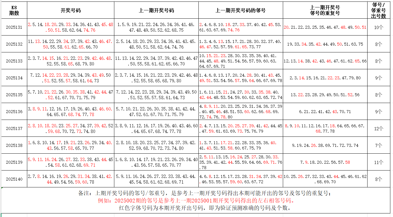 如图,红色字体是上期邻号、邻重号在下期开出,每期开出10个左右。上期邻号开出6个,邻重号开出2个。本期参考邻号:1.3.6.9.13.17.18.20.25.27.28.32.33.35.37.39.40.45.48.50.53.57.58.61.77.79;邻重号:7.8.15.30.41.42.43.55.59.60;个人分析,仅供参考。