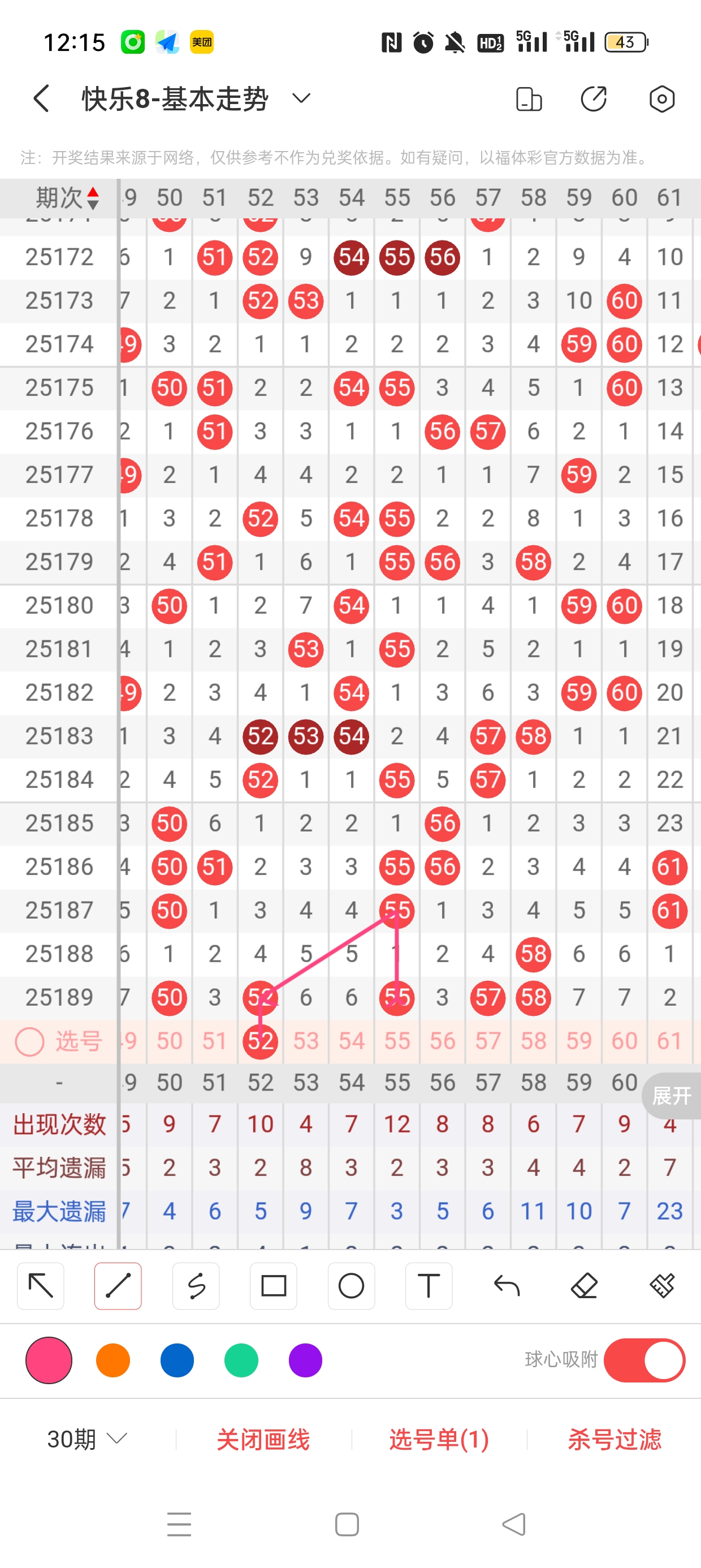 三区(41-60)近五期本区奇偶比320:290,奇数热度高,本期着重偶数。近五期本区和值:235:212:195:192:302,和值上升,本期着重下降,取中间值300。近五期本区区间比值:4:4:3:3:7,近两期出号个数为10,本期着重出号个数为5。近五期本区同尾号比值为2,本期着重同尾同尾比值为2。52作为传号,呈现直落回补态势,需防。